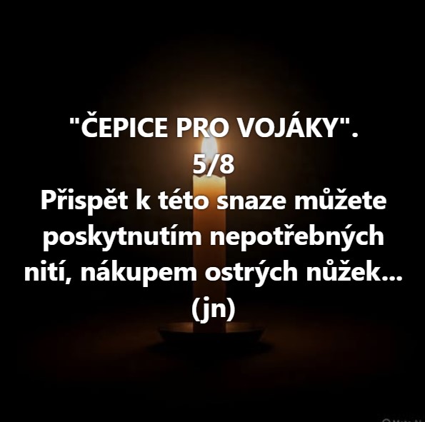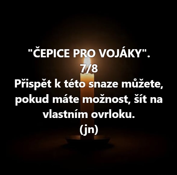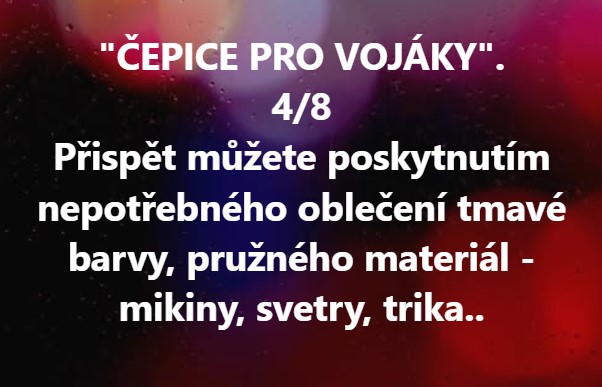 Nemusíme dávat ze svého nedostatku. Myslím, že naopak máme nadbytek oblečení, které už nevyužíváme… nebo se nám změnila velikost… Poskytněme ho na šití pro vojáky. Sem tam díra nevadí, ale prosím o vyprané kousky.